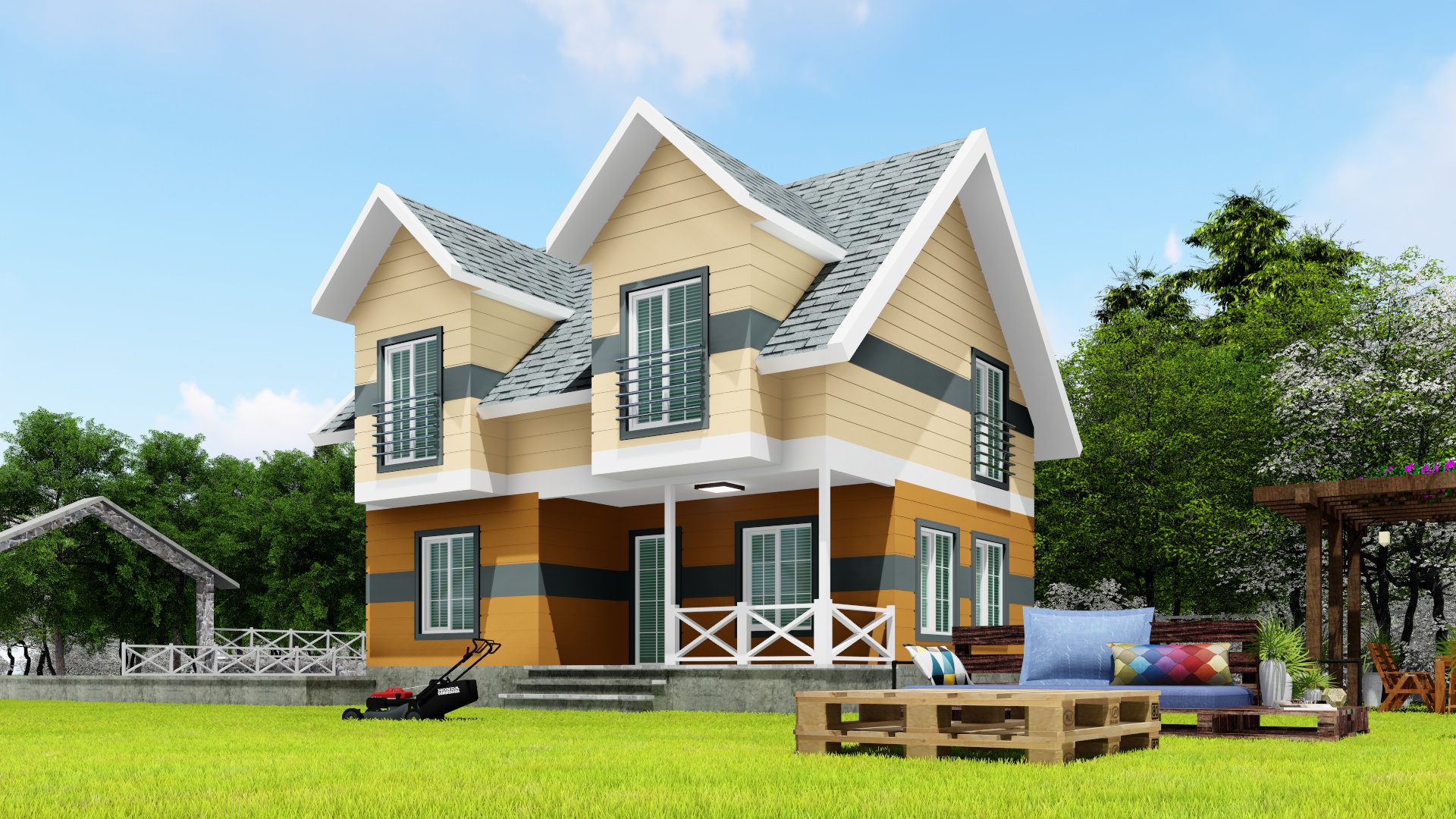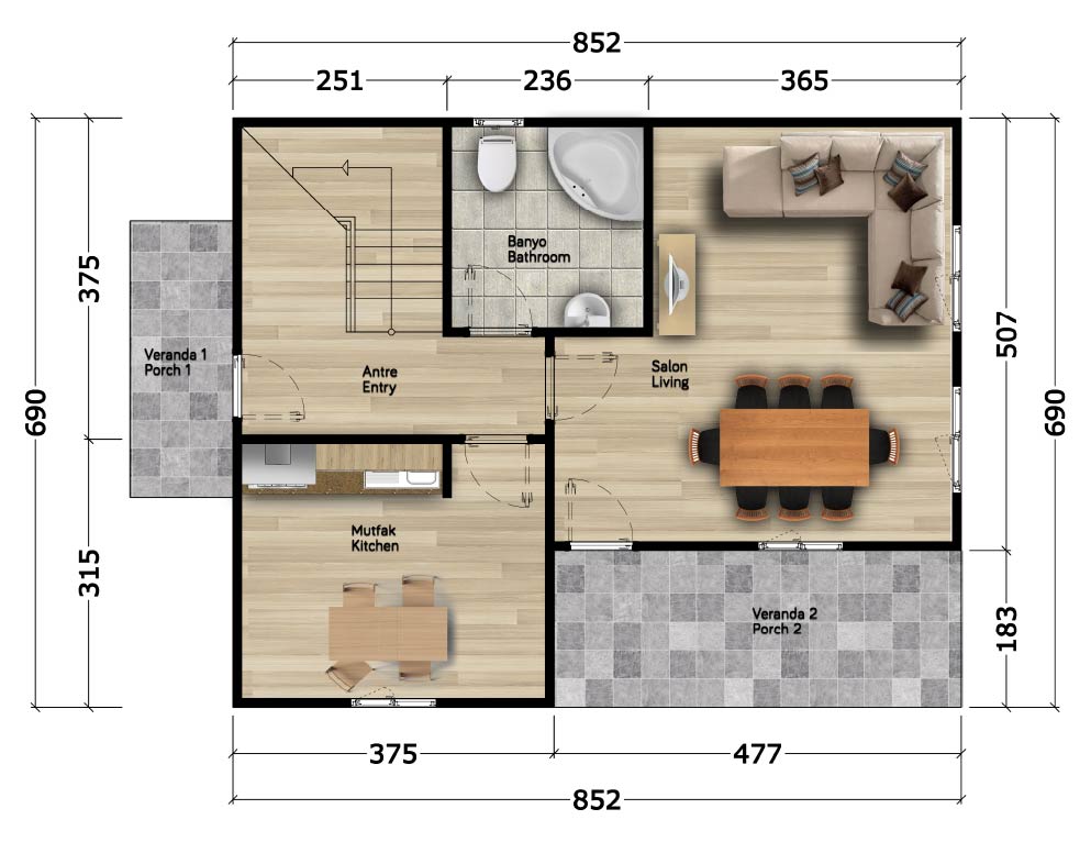 125m²Zemin Kat ( 62.5m² )Salon : 20m²Mutfak : 11m²Banyo : 5m²Antre : 10m²Veranda 1 : 4m²Veranda 2 : 10m²
