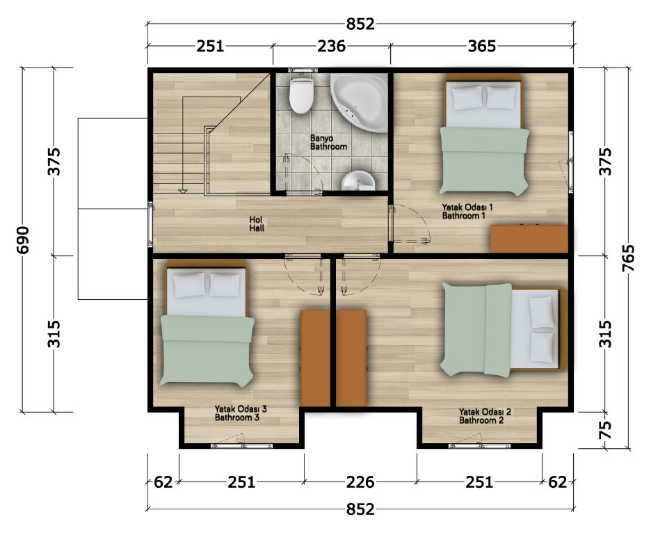 Normal Kat ( 62.5m² )Yatak Odası 1 : 13m²Yatak Odası 2 : 16m²Yatak Odası 3 : 13m²Banyo : 5m²Hol : 6m²