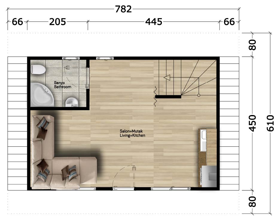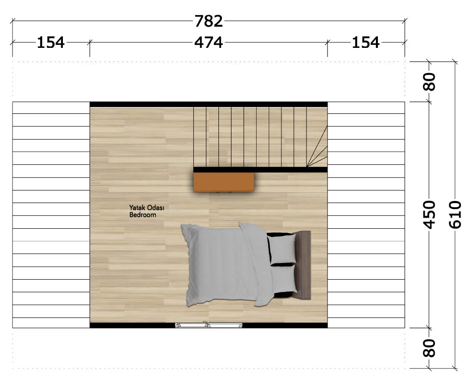 52m²Model No : 20Zemin Kat ( 30m² )Salon+Mutfak : 24m²Banyo : 3m²