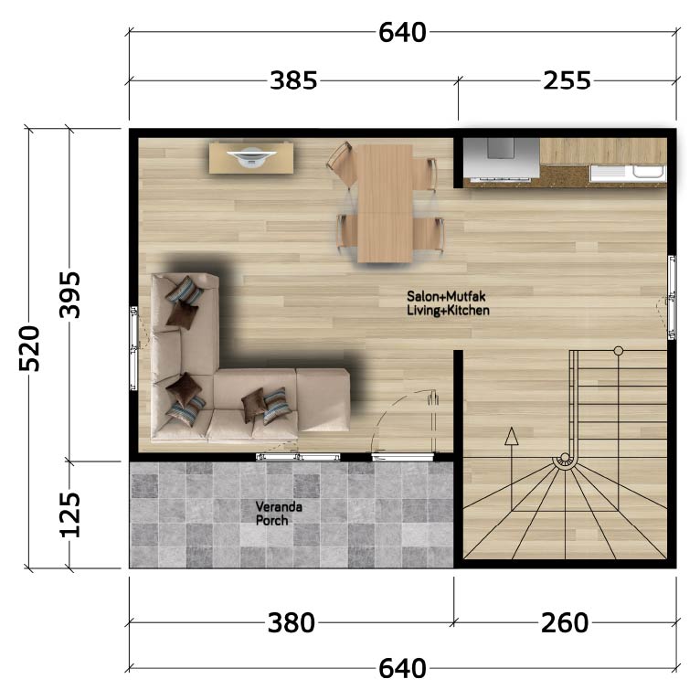 66m²Zemin Kat ( 33m² )Salon+Mutfak : 27m²Veranda : 5m²