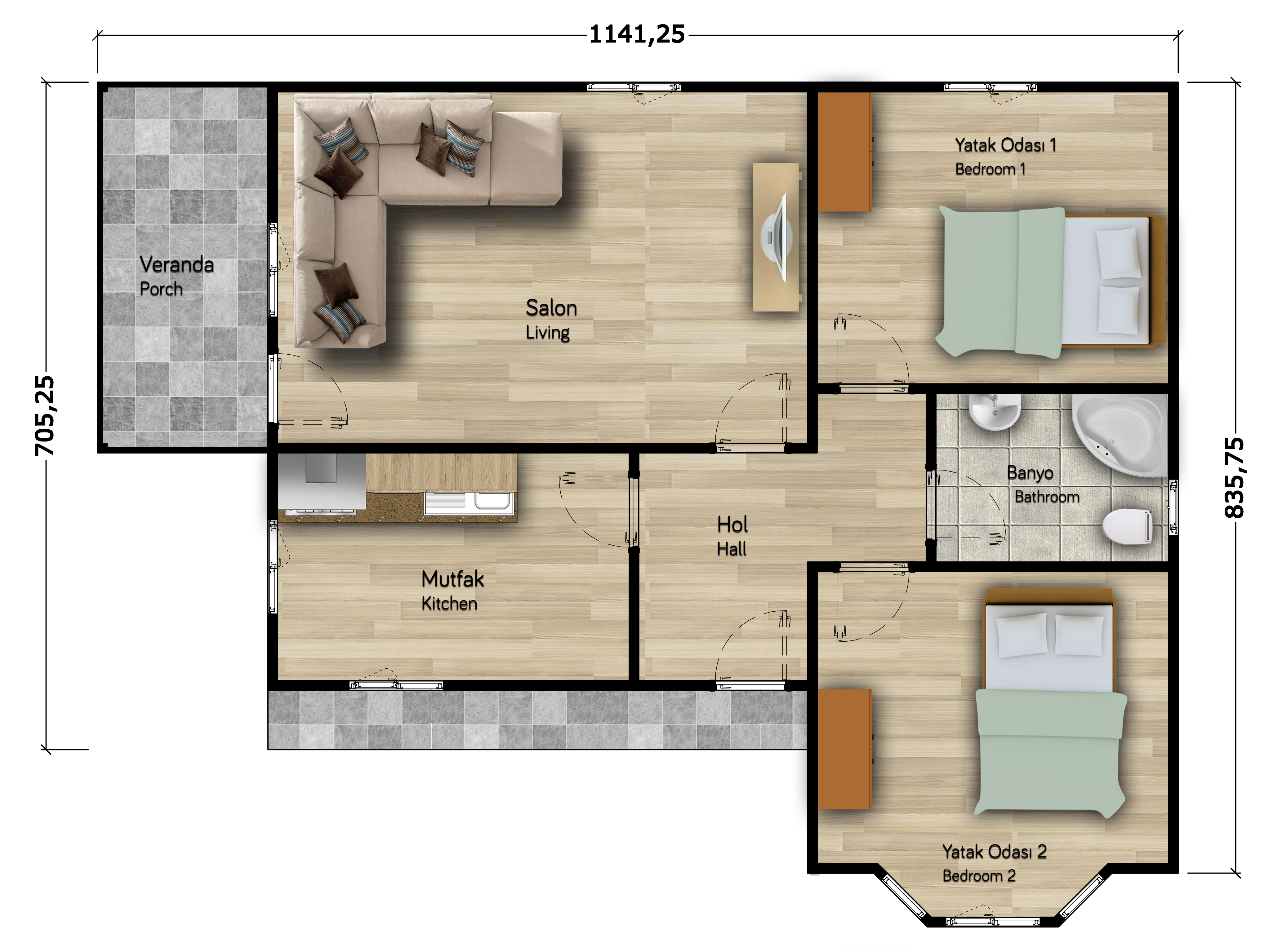 81m² 2+1Salon : 21m²Mutfak : 9m²Yatak Odası 1 : 12.5m²Yatak Odası 2 : 11.5m²Banyo/Wc : 4.5m²Hol : 7m²Veranda : 7m²