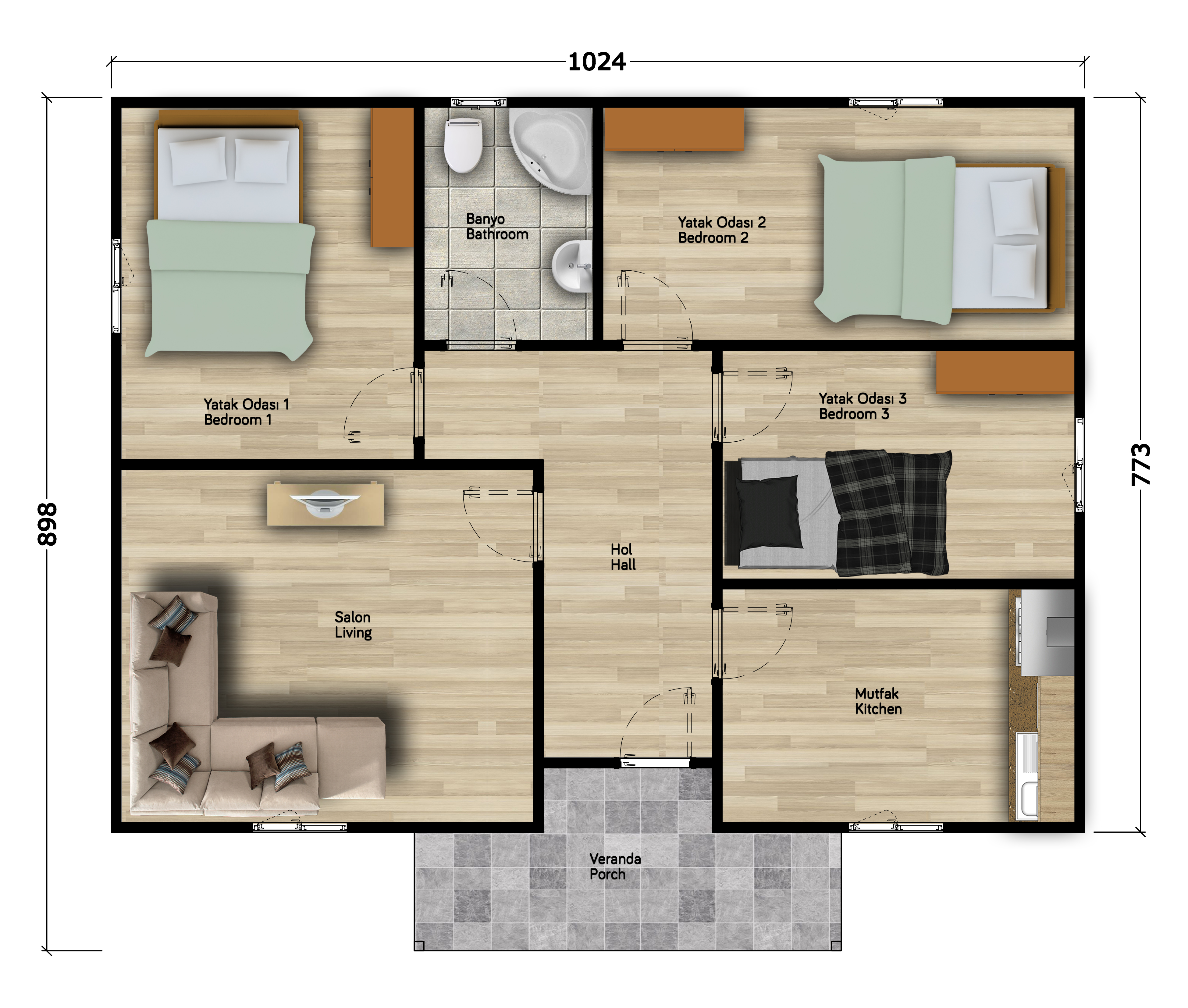84m² 3+1Salon : 16.5m²Mutfak : 9.5m²Yatak Odası 1 : 11.5m²Yatak Odası 2 : 12.5m²Yatak Odası 3 : 9m²Banyo/Wc : 4.5m²Hol : 9m²Veranda : 7m²