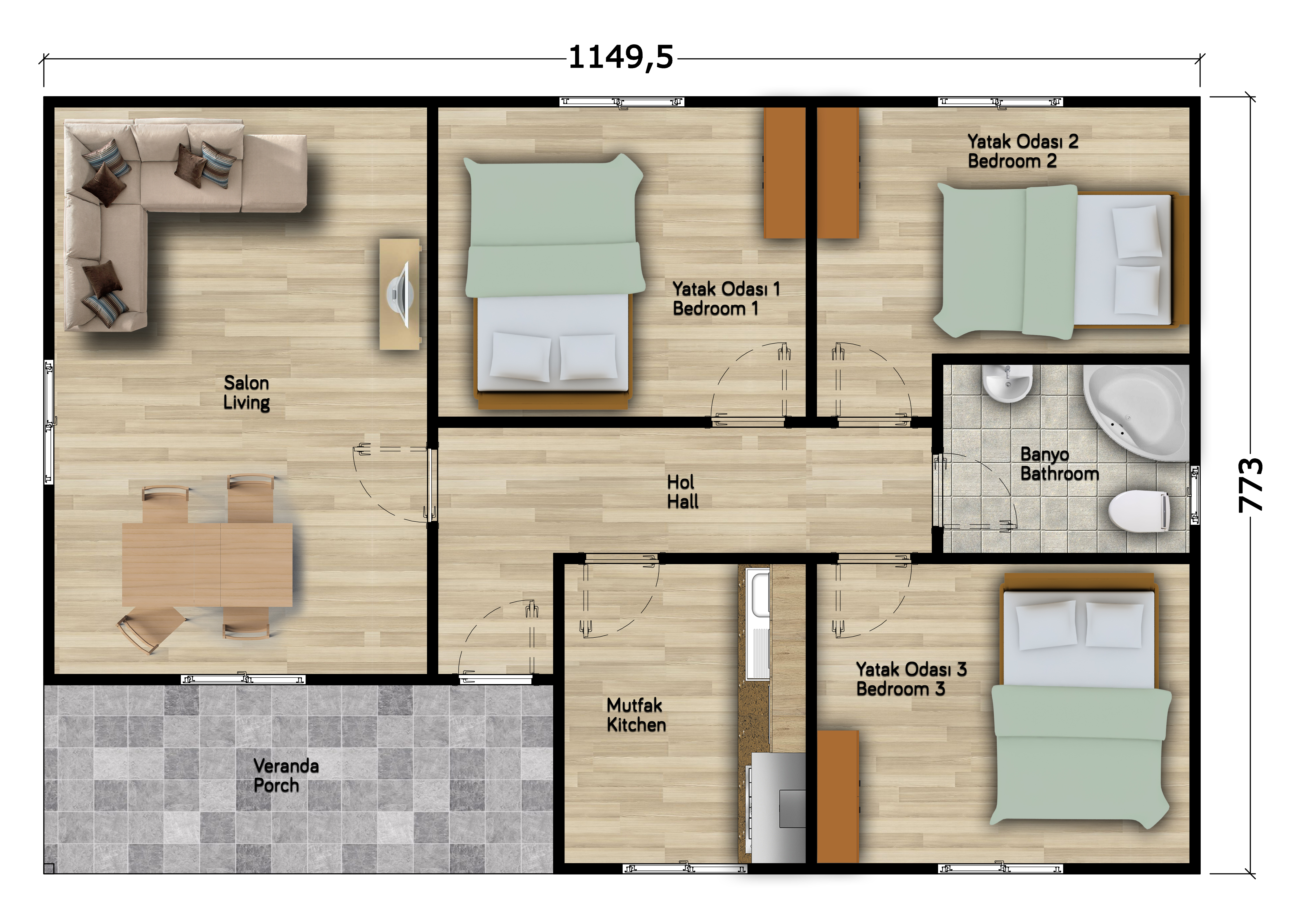 90m² 3+1Salon : 21m²Mutfak : 7.5m²Yatak Odası 1 : 11.5m²Yatak Odası 2 : 10m²Yatak Odası 3 : 11.5m²Banyo/Wc : 4.5m²Hol : 8m²Veranda : 10m²