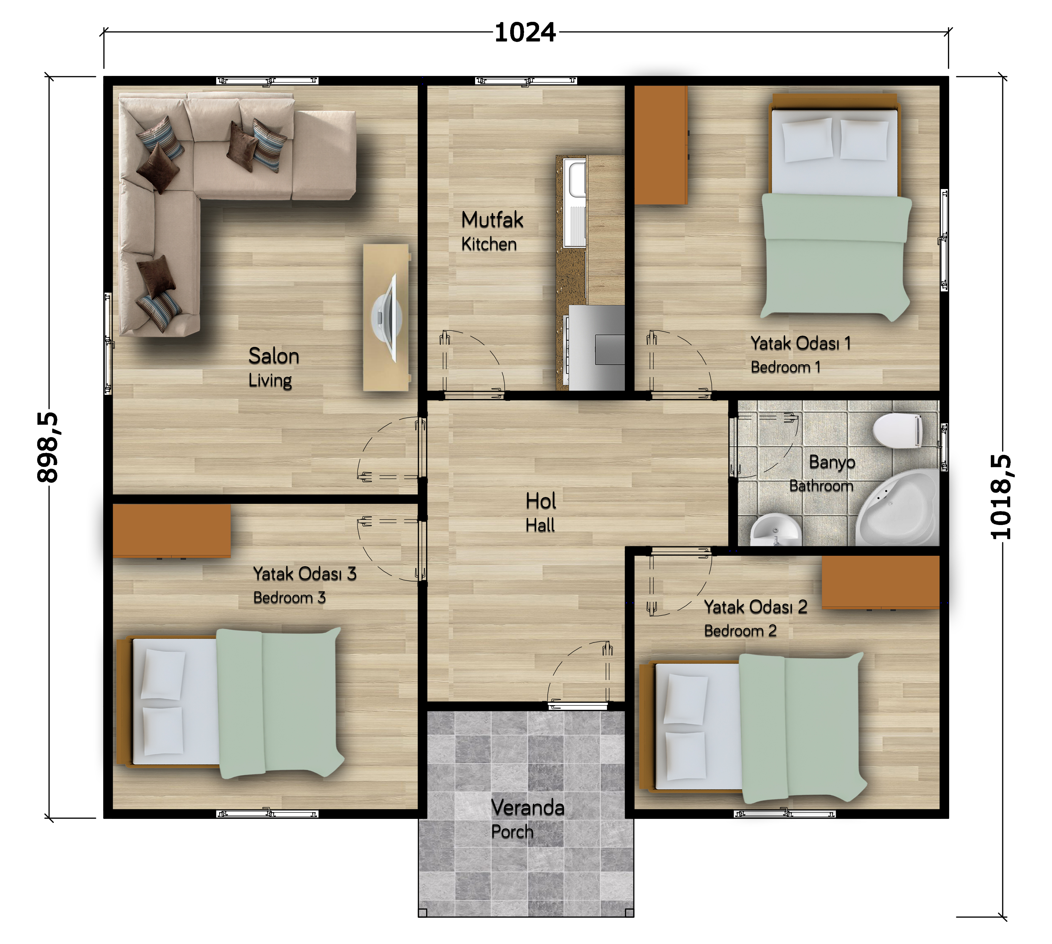 92m² 3+1Salon : 18.5m²Mutfak : 9m²Yatak Odası 1 : 14m²Yatak Odası 2 : 11.5m²Yatak Odası 3 : 14m²Banyo/Wc : 4.5m²Hol : 11m²Veranda : 6.5m²
