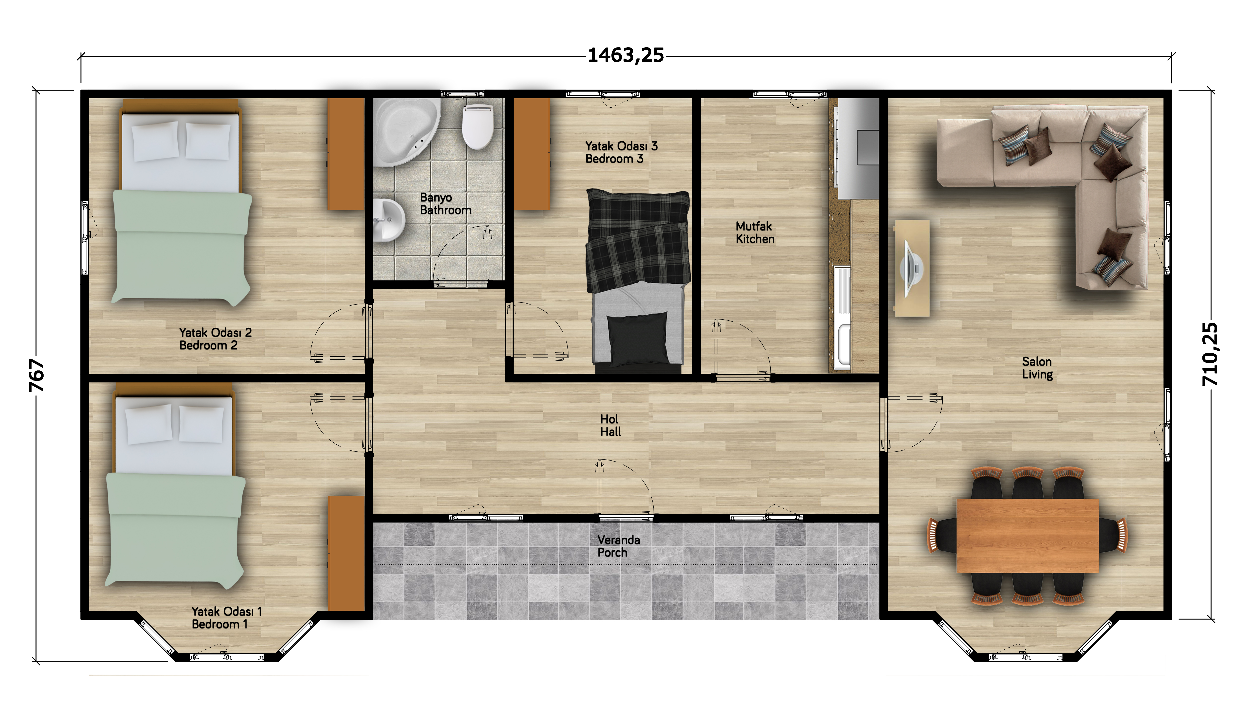 98m² 3+1Salon : 27m²Mutfak : 9m²Yatak Odası 1 : 12.5m²Yatak Odası 2 : 14m²Yatak Odası 3 : 9m²Banyo/Wc : 4.5m²Hol : 14.5m²Veranda : 4m²